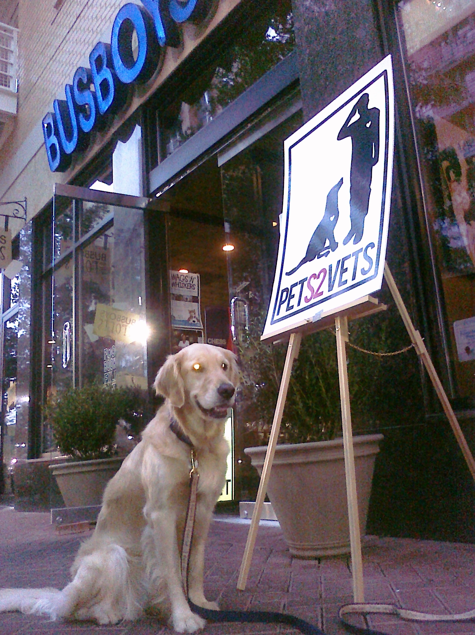 Chatham, Sundae and I went to Shirlington Village last night for the Busboys & Poets Nonprofit Tuesdays to benefit PETS2VETS. The group had big signs out front of the restaurant as well as inside, which drew a lot of attention.