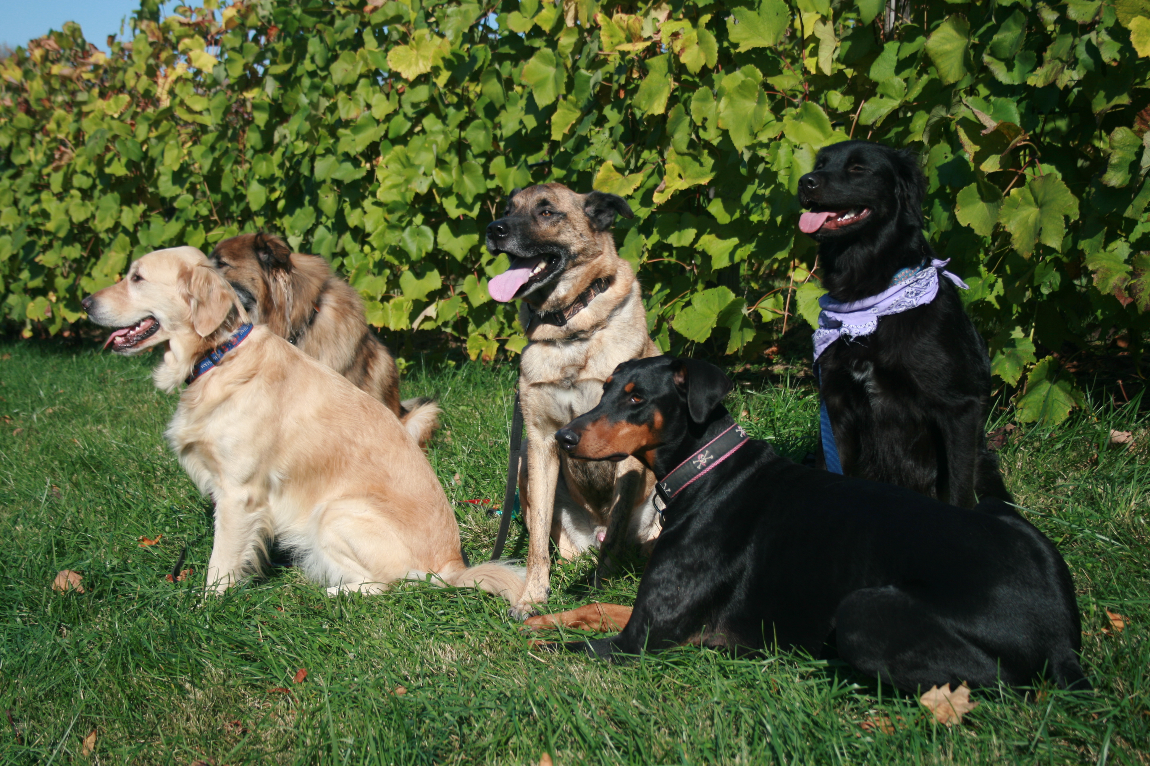 While we enjoyed our post-tasting picnic lunch, the dogs wrestled each other, begged for food, rolled in the grass, and barked greetings every time a new dog came into view. They met Labs, Poodles, Beagles and more than a few mutts. Before we left, we managed to get the whole crew to sit still for a few seconds to take a group picture in front of the vines. Chrysalis gets a “paws-up!”