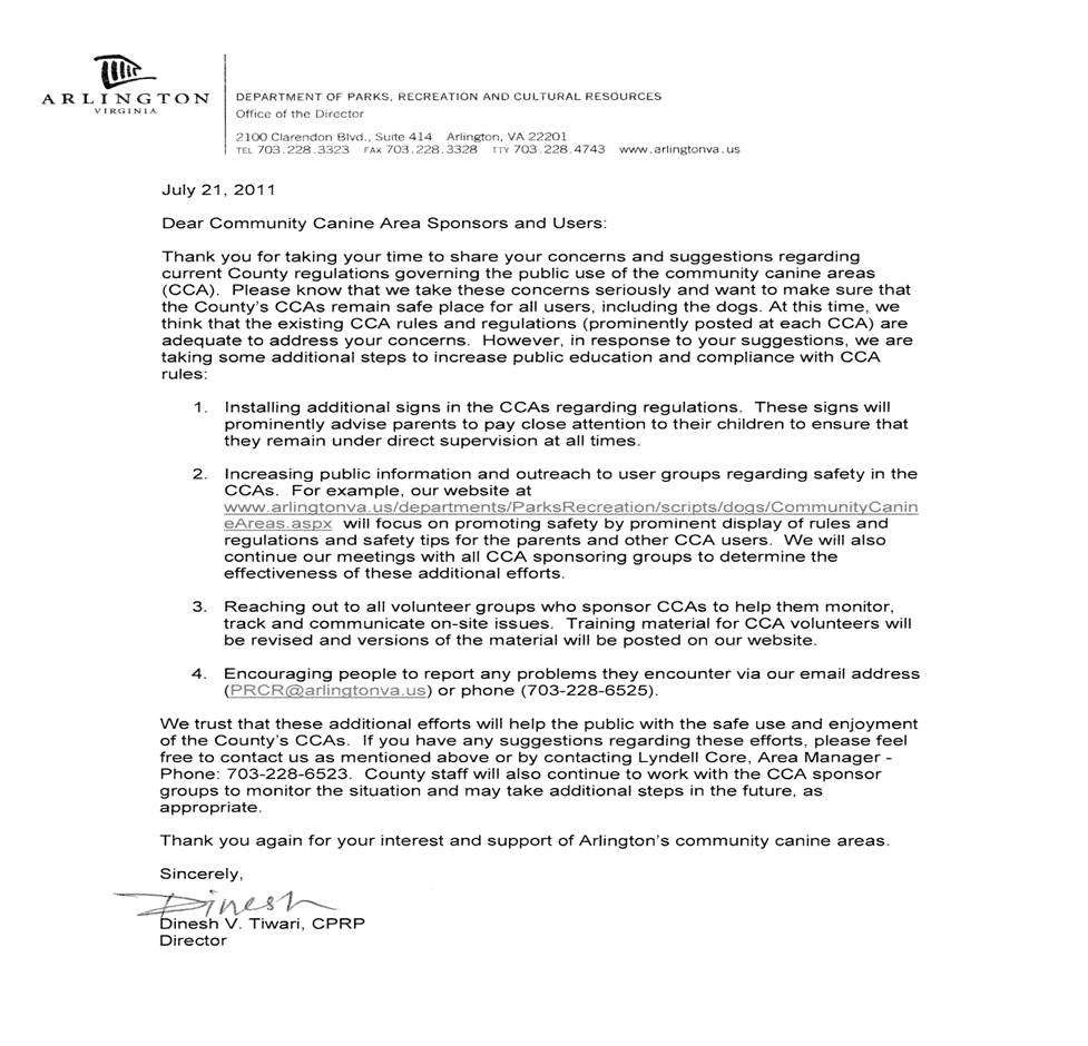 In a letter emailed to CCA users and sponsors on July 21, Dinesh Tiwari, director of Arlington County’s Department of Parks, Recreation and Cultural Services, said, “At this time, we think that the existing CCA rules and regulations (prominently posted at each CCA) are adequate to address your concerns.”
