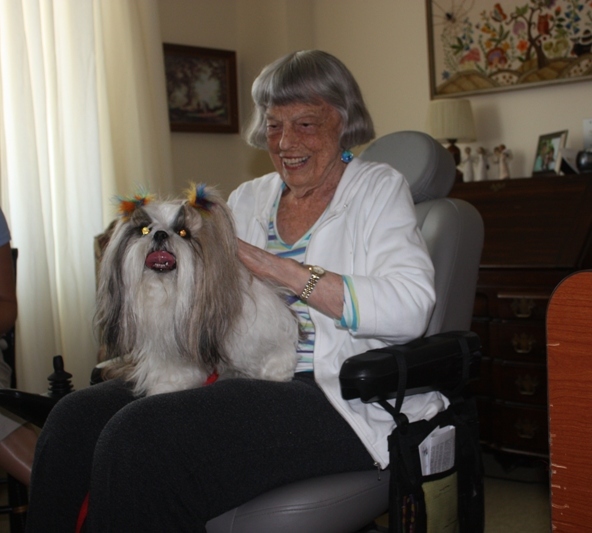 We spent time first with Della Rand, who moved to Virginia from Pittsburgh to be closer to her daughter. It was Della’s first time having a PAL visit, but she gladly took Mimi, a Shi Tzu with colorful ribbons in her hair, on her lap. Della told us that she used to be a therapist, and that she’d always had dogs. Her most recent dog was a white poodle named Maggie who now lived with her granddaughter.