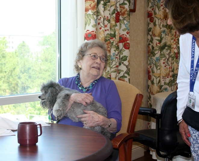 While both my dogs are friendly to people and other dogs, I thought Chatham’s laid-back attitude would be better suited to a nursing home. So on a Saturday morning I brought her to the Goodwin House retirement community in Falls Church, Va., where I met up with the PAL Group Leader Stephanie and Colleen Mallon, corporate director of marketing for Goodwin House.