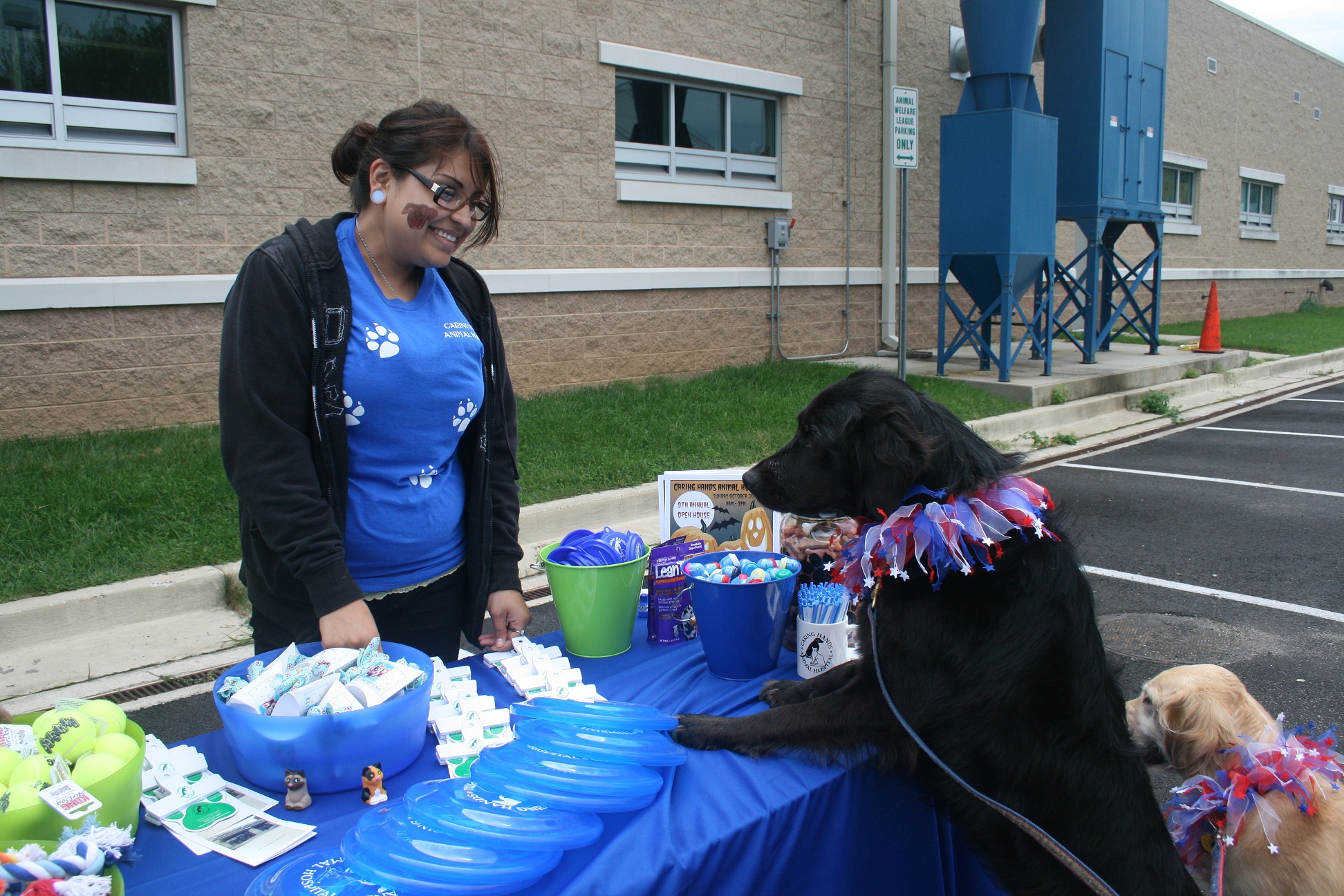 Sundae makes friends with a staffer from Caring Hands Animal Hospital at their booth at AWLA’s Animal House.