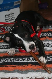 Buckwheat is a sweet, laid-back puppy who happily chewed on a stick in front of the Woofs! Dog Training Center table. He is being fostered at Woofs and waiting for someone to adopt him.