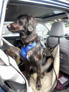An added advantage to having a dog wear a harness during travel is that it give you a sturdy handle to grab hold of when needed. I have found this helpful when dogs are in the water and when helping them over difficult obstacles on a hike.