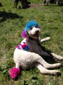 Some dogs wore festive attire, and some, like this poodle—who had a paw print on one side and a peace sign on the other—sported more permanent decoration.