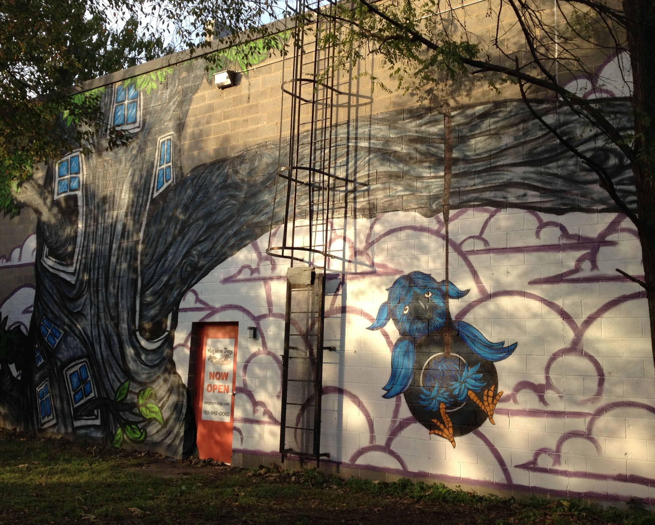 A cute mural featuring cavorting dogs that was painted on the exterior wall of Arlington’s Wag More Dogs doggie day care is no more. It was the subject of an extended court battle between the business owner and Arlington County, who considered the artwork illegal advertising for the business.