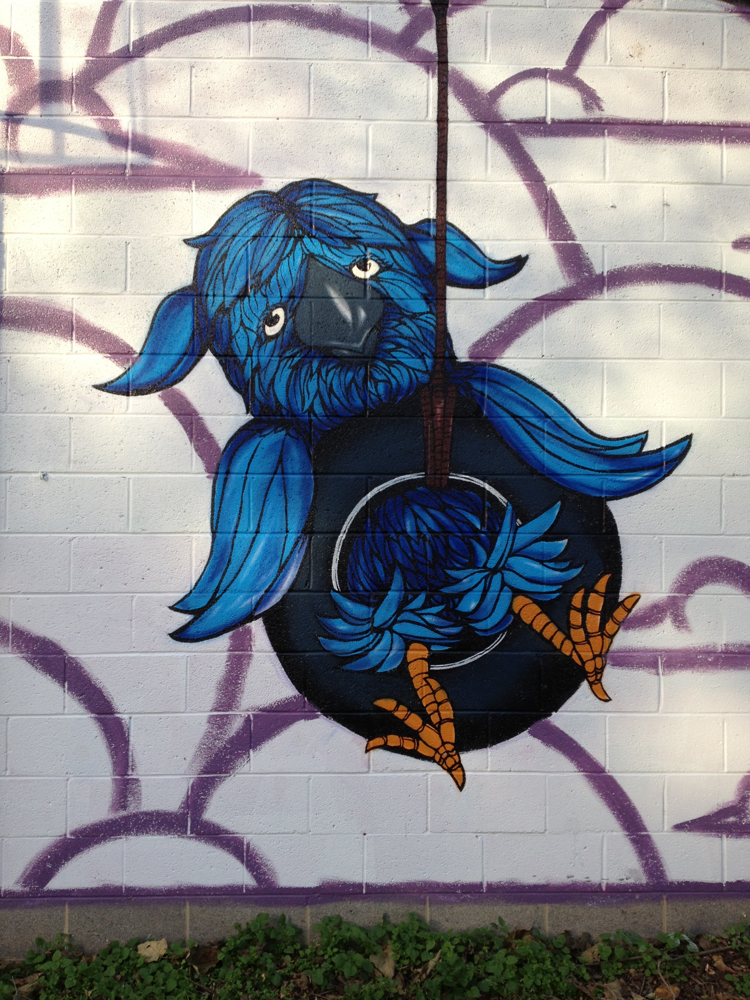 There’s a tree with windows, a creature that bears a slight resemblance to a bird in a tire swing, and two more brightly-colored creatures sitting in a nest that appears to be filled with water.