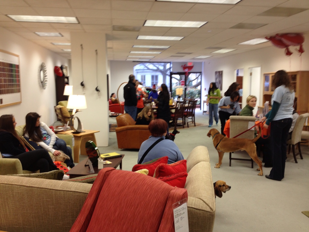 The pet adoption event at Pompanoosuc Mills furniture store in Old Town Alexandria on Saturday, Feb. 16, drew a steady stream of foot and paw traffic despite the chilly temperatures and sporadic snow flurries. There were about a dozen adoptable dogs from Homeward Trails Animal Rescue hanging out on the custom furniture waiting to meet their forever families.
