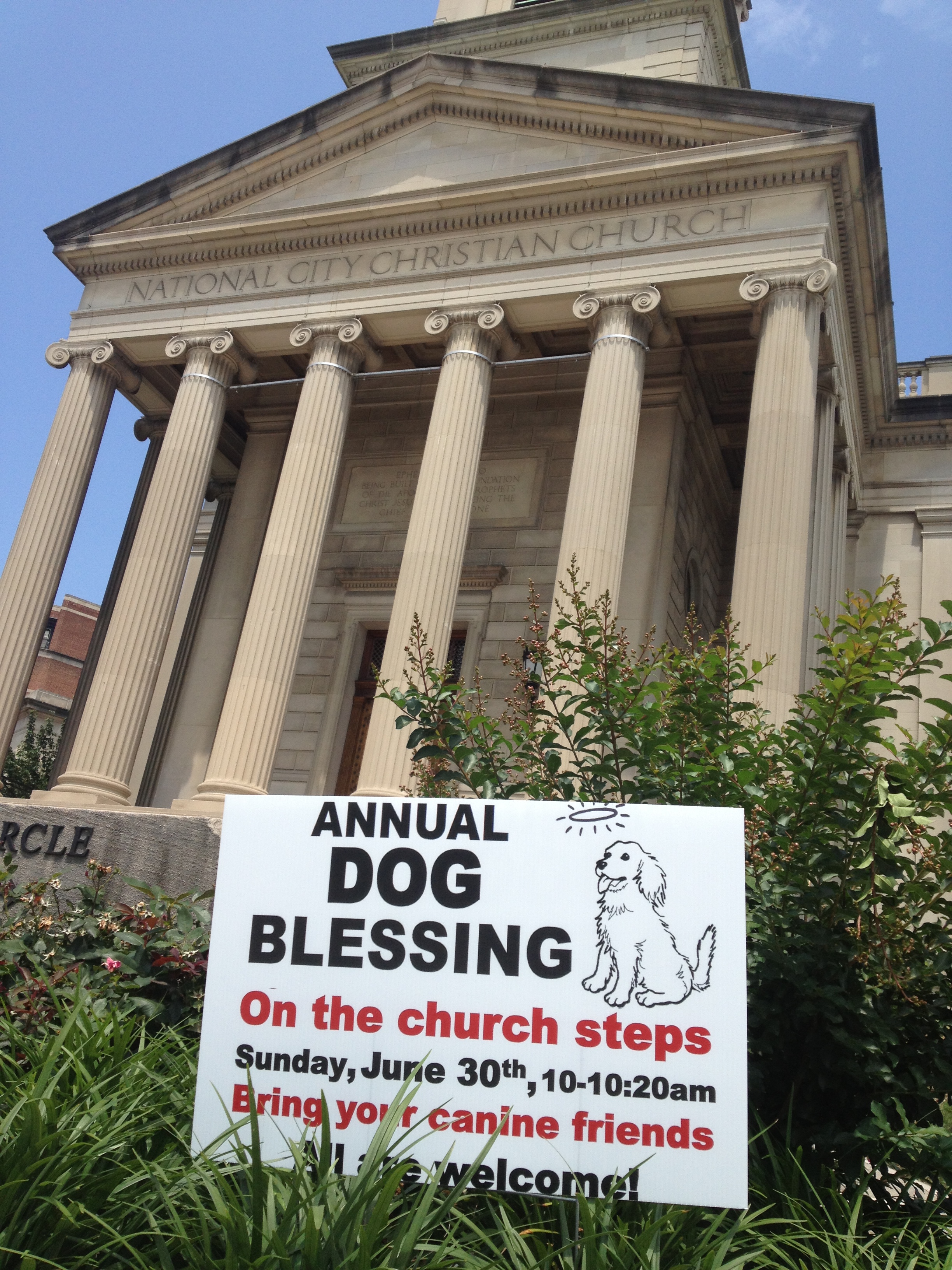 The church is holding its annual dog blessing on the church steps from 10:00 am to 10:20 am. National City Christian Church was completed in 1930, and designed by the same architect who designed the Jefferson Memorial and the National Archives.