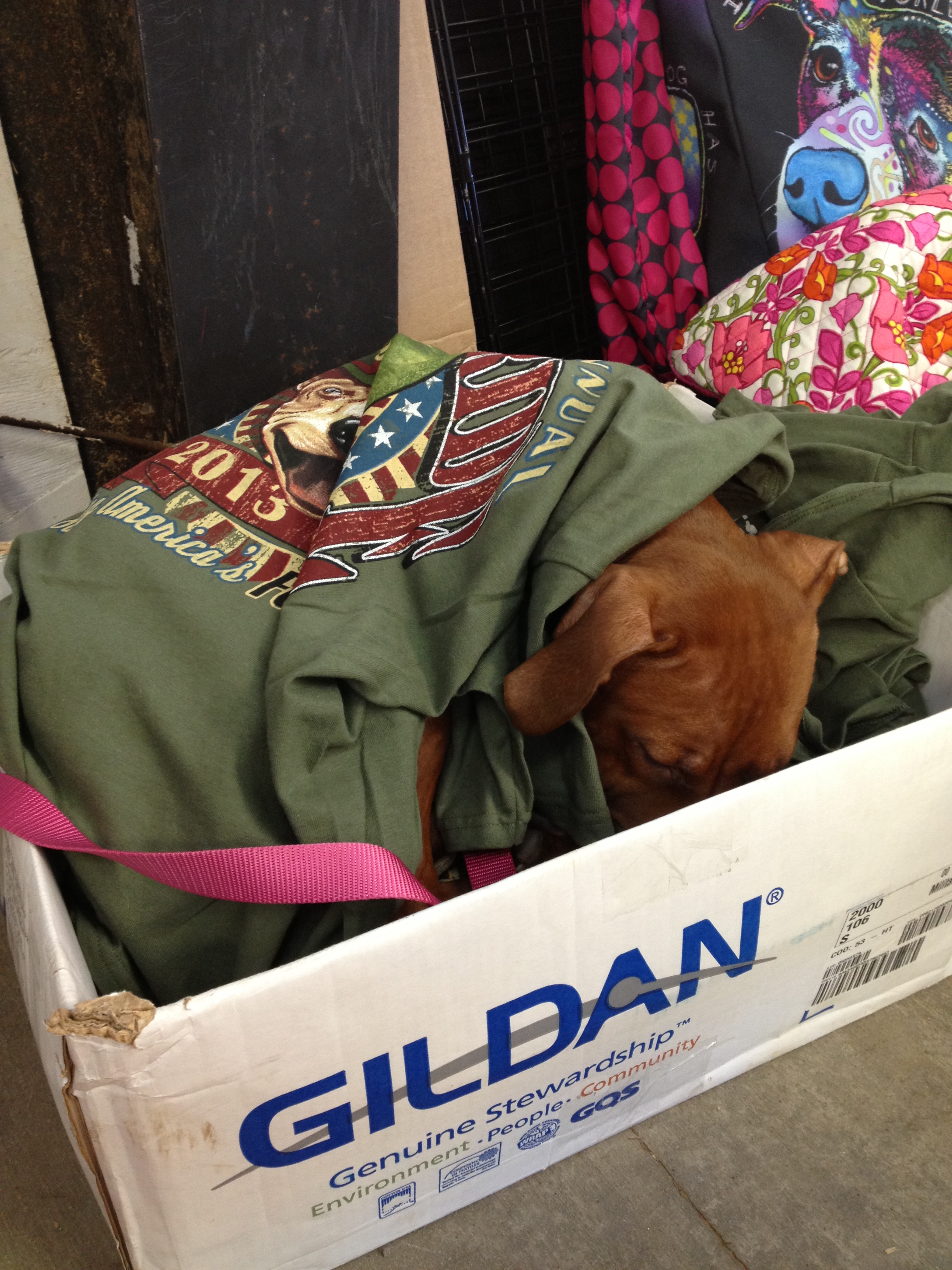 This sweet little guy, up for adoption from Sleepy’s Dream Pit Bull Rescue, kept warm and caught some shut-eye while guarding the booth’s stock of t-shirts at the same time!