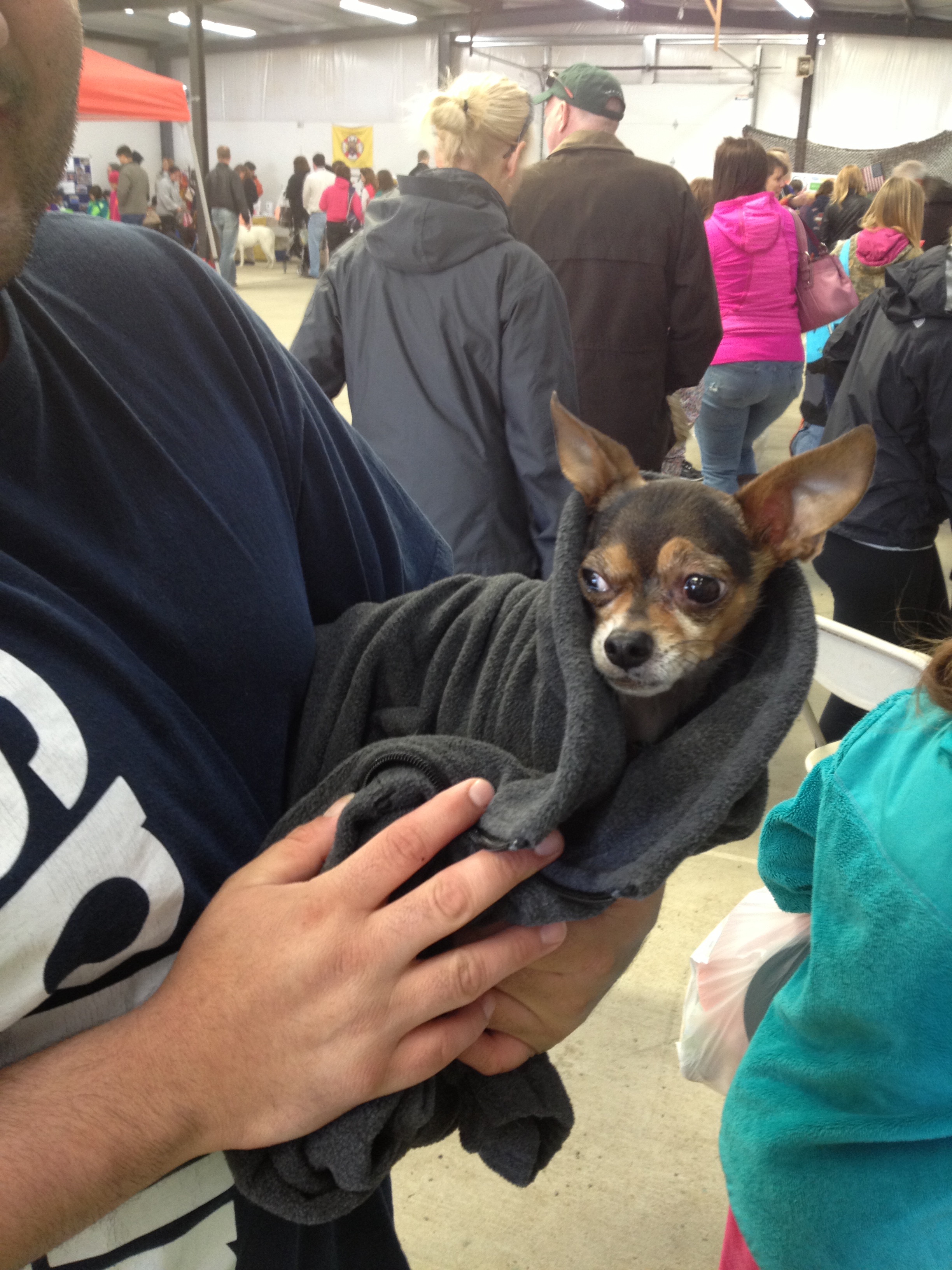 Other pups kept warm wrapped in their owner’s coats while their owner shivered in short sleeves.