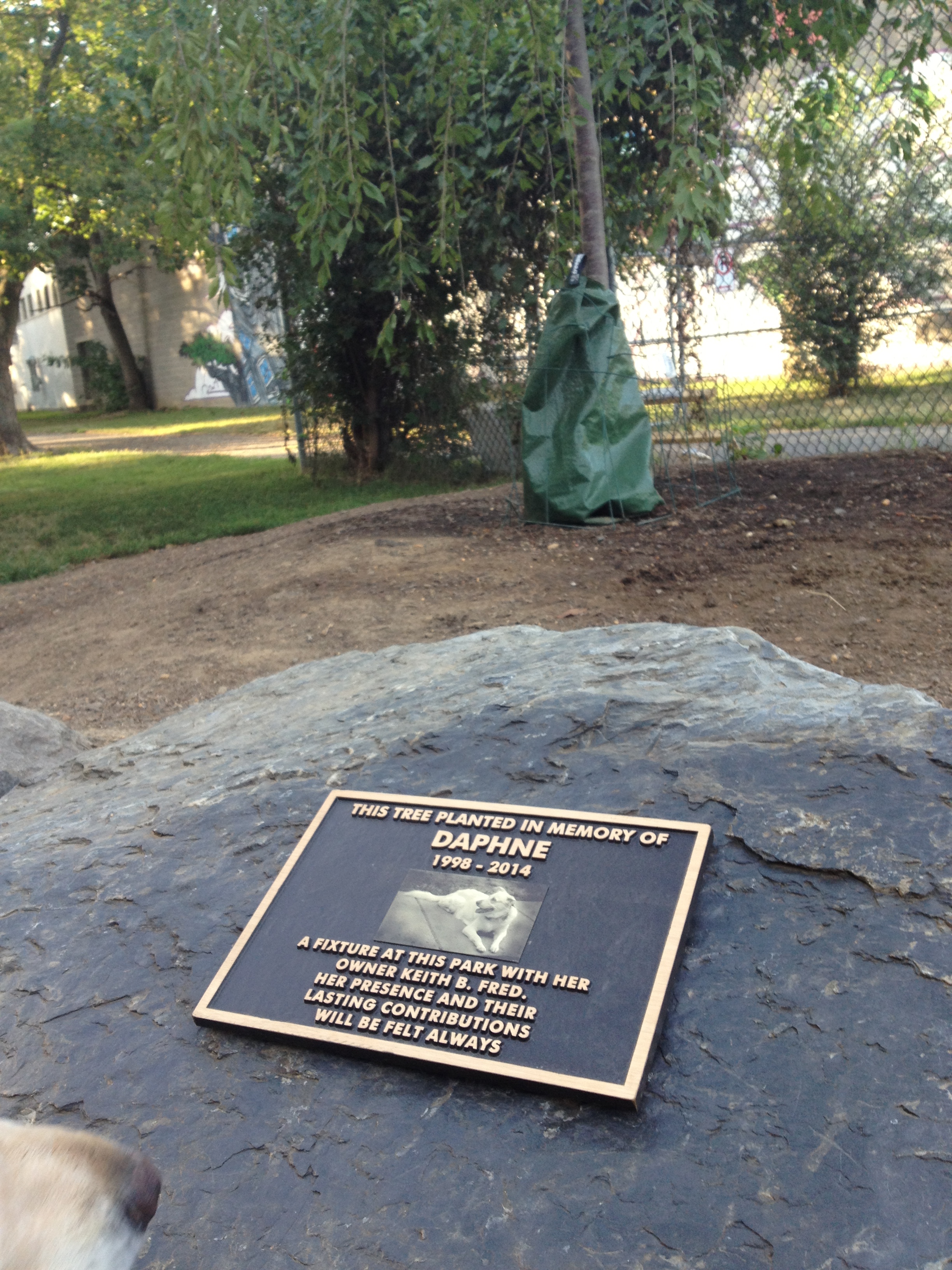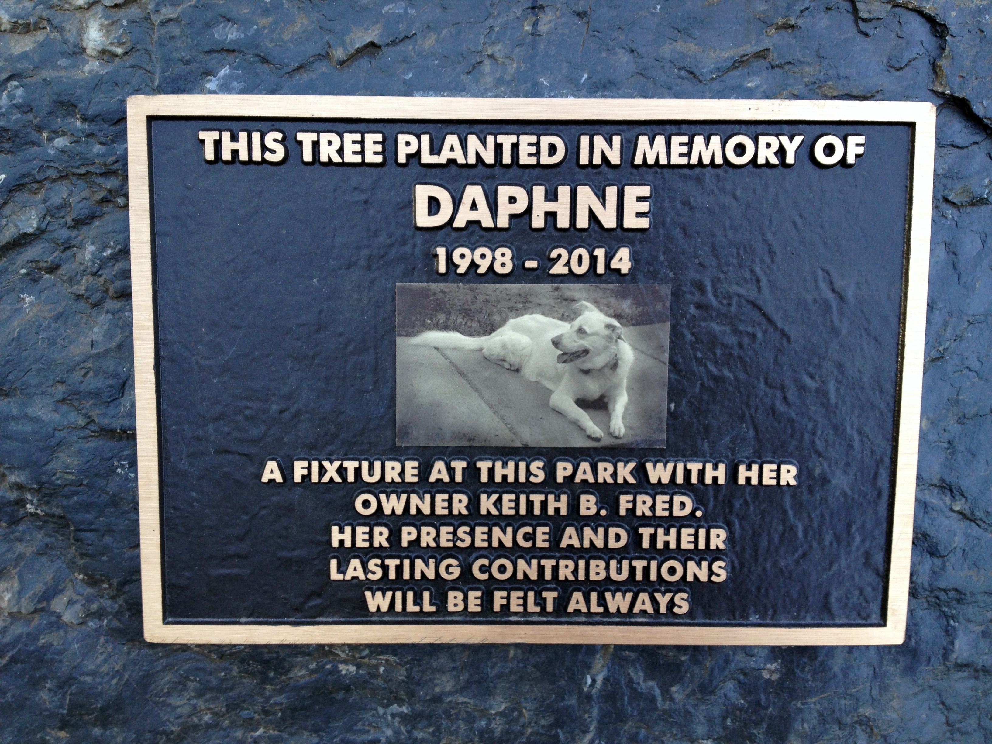 A memorial plaque and tree were recently installed to honor Daphne’s faithful companionship.